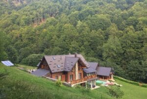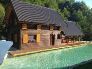 The estate consists of two houses covered in wood, a villa of 430 m2 and a mountain chalet of 120 m2, separated by a swimming pool of large size (23m x 7.5m), which is fed with natural water from the mountain stream that crosses the property. It also has a fenced vegetable garden with a shed for garden tools, a large chicken coop, many decorative and fruit trees and shrubs, a very large lawn and a large number of spaces arranged for a social outdoor life (several BBQ and tables), sporty or relaxing enjoyable. The whole property is in very good condition and does not require any further renovation.