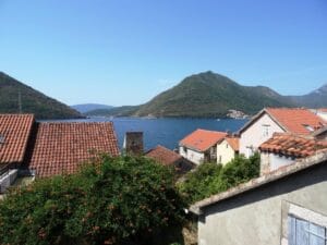 The upper floors are accessed by a spiral staircase that leads up to three bedrooms. On the first floor there are two bedrooms (double/twin) with whitewashed walls, exposed internal stone walls and wooden flooring and a shower room . The top floor, in the eaves, has spectacular views across Kotor Bay and comprises a double bedroom with a small en-suite shower room.