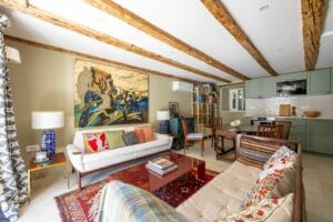 Living area: Open-plan kitchen, dining, and living room with French doors opening onto the terrace