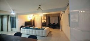 – Bright living room with kitchen and dining area in an open-plan layout