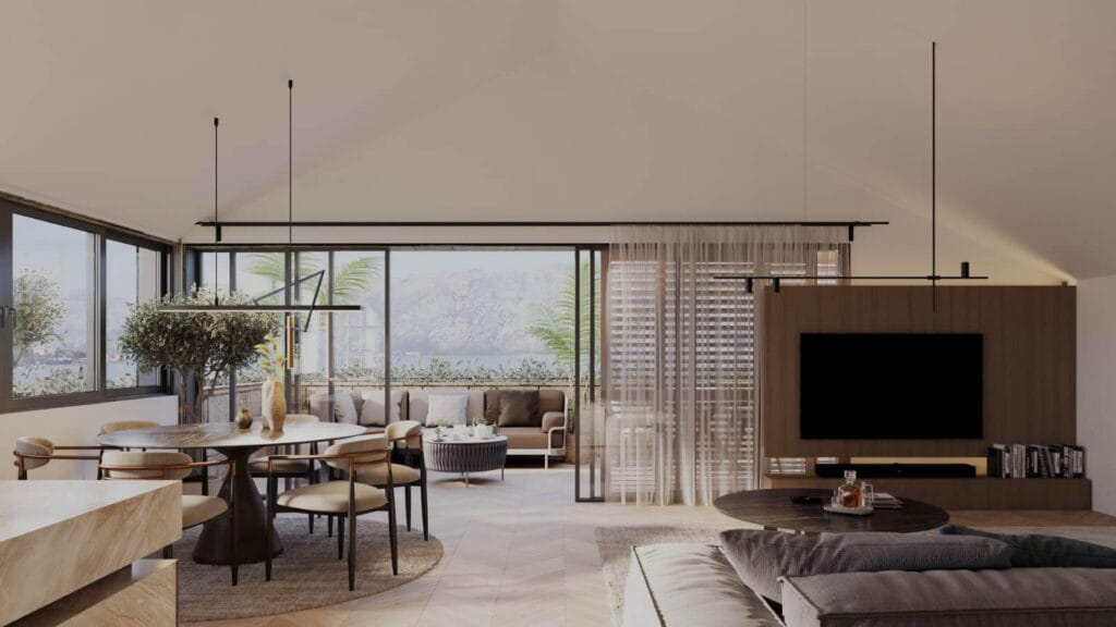 A three-bedroom penthouse with garage and swimming pool access is available for sale in a boutique residential building with an elevator, set in a prime seafront location in Dobrota. Positioned on the top floor, the property offers a total interior area of 110 m².