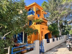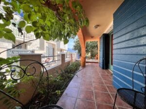 Nestled in a tranquil and green neighborhood, the villa presents a harmonious blend of rustic hacienda-style decor and picturesque details. The ground floor features an open living room with a kitchen and dining area, a sea-facing terrace, a large storage room, and a bathroom. Internal stairs lead to the upper level with three bedrooms, a bathroom, and a balcony offering a partial sea view. The top level boasts two more bedrooms, a bathroom, an anteroom, and an additional terrace facing the sea.