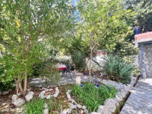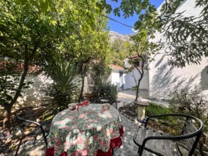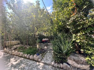 The property also includes a private parking spot and a small, secluded garden with orange and lemon trees. At the back, there’s an auxiliary building equipped with a summer kitchen and storage space.