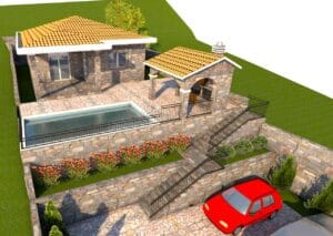 Located in the peaceful village of Kovači, in the Grbalj region of Kotor, this property is part of a small residential complex of four villas surrounded by greenery.