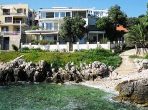 The villa is 497m2, and the plot is 375m2. The edge of the ground floor terrace is literally 10 metres from the water and 25 metres from a small pebble beach. The garden is planted with Palm trees, tangerine and lemon.