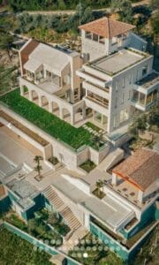 The estate is beautifully landscaped with various decorative plants and fruit trees, including an ancient olive tree estimated to be around a thousand years old.