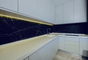 – Ground floor: A bright and spacious open-plan living area with a kitchen, fireplace, and high ceilings. Floor-to-ceiling windows flood the space with natural light, creating a warm and inviting atmosphere. The interior is custom-built in a refined, luxurious style.