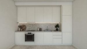 The interior features an open-plan living and dining area with contemporary design and quality materials throughout. The fully equipped kitchen blends seamlessly into the space, and the apartment is sold with all fitted furniture included, allowing for an easy move-in or immediate rental use. An internal storage area further enhances practicality.