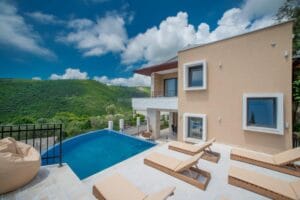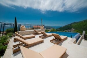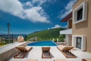 This beautiful villa has panoramic views over the open sea, three bedrooms, three bathrooms, large open plan living area, kitchen with dining room. In front of the villa is a pool with a garden and BBQ area.