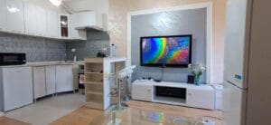 – Living Room: A cozy and stylish area equipped with a corner sofa and TV, perfect for relaxation.