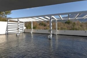 Designed in a minimalist style, the property provides scenic views of the surrounding hills and nature from every floor.