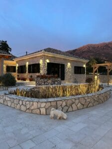 The main house is a thoughtfully renovated single-story stone villa offering 120m² of living space. It comprises two spacious bedrooms, a living room with an open kitchen and dining area, a bathroom with a toilet, an additional guest toilet, and a generous entrance hall with a foyer. The house is equipped with solar panels, underfloor heating beneath traditional stone flooring, and a central air-conditioning system with three indoor units.