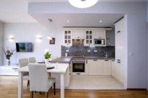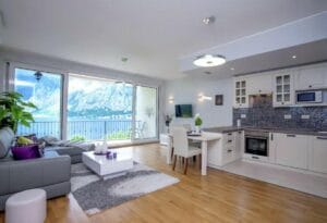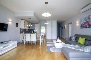 This charming three-bedroom apartment is located in a modern building with a shared pool and a private garage in Prčanj.