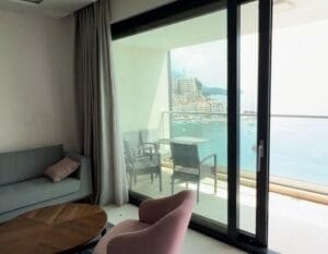 A modern apartment is available for sale in an exclusive building located directly on the seafront.