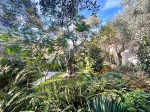 The plot features productive olive trees, mandarins, oranges, plums, pears, peaches, cherries, grapes, kiwi, as well as ornamental trees and flowers.