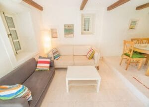 The upper floors are accessed by a spiral staircase that leads up to three bedrooms. On the first floor there are two bedrooms (double/twin) with whitewashed walls, exposed internal stone walls and wooden flooring and a shower room . The top floor, in the eaves, has spectacular views across Kotor Bay and comprises a double bedroom with a small en-suite shower room.