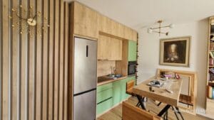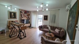 The apartment is being sold fully furnished with new, high-quality furniture. The space has been minimally used, so all appliances and furnishings are nearly brand new. A garage space is also included.