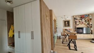The apartment features an entrance hall, a bathroom, a bedroom with built-in wardrobes, and a living room connected to the kitchen, leading out to a spacious 64m² terrace. The terrace offers great potential for adaptation, such as the installation of glass panels, which could expand the usable space of the apartment.